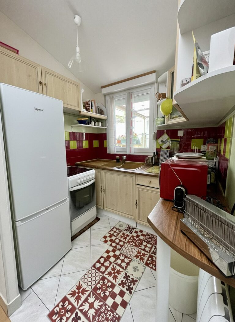 Cuisine indépendante aménagée avec meuble bas et haut sur carrelage