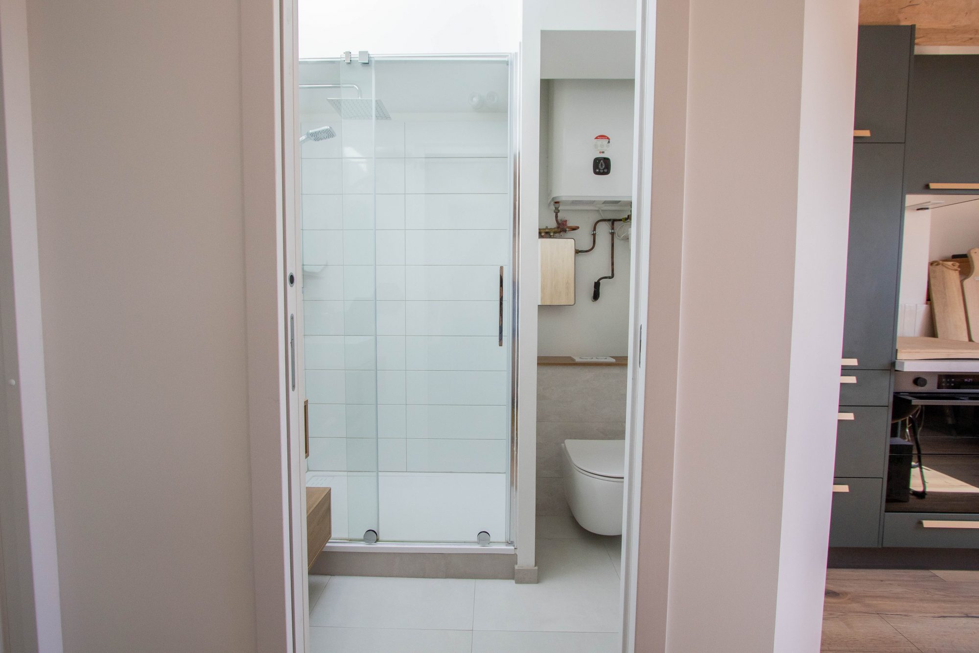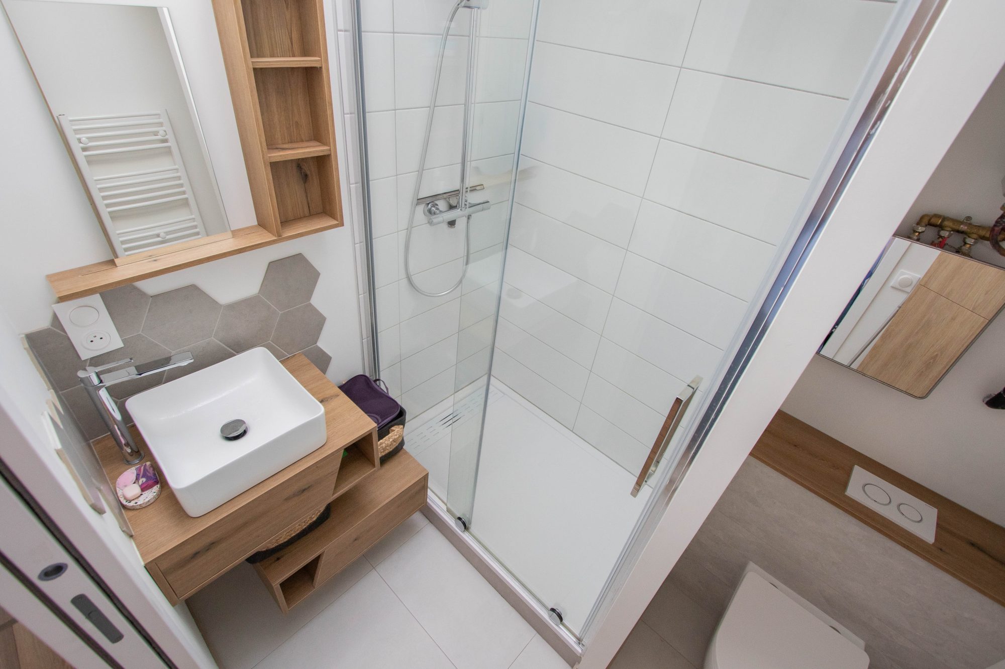 Salle d'eau, sur carrelage, avec wc, douche, simple vasque et sèche serviette électrique
