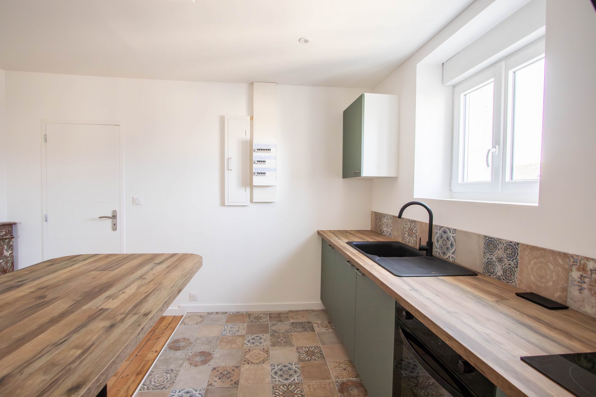 Pièce à vivre, avec cuisine A/E (plaque, four, hotte), emplacement pour LV, sur carrelage et parquet d'origine