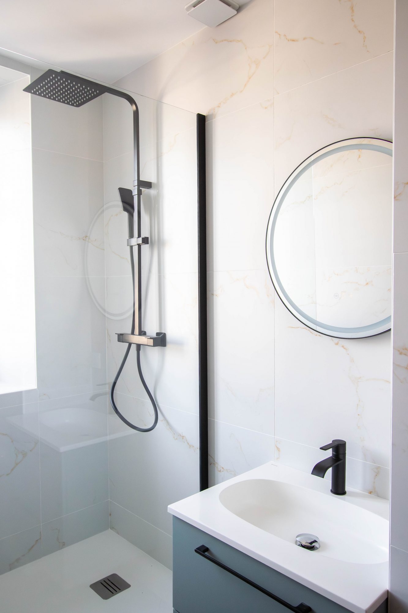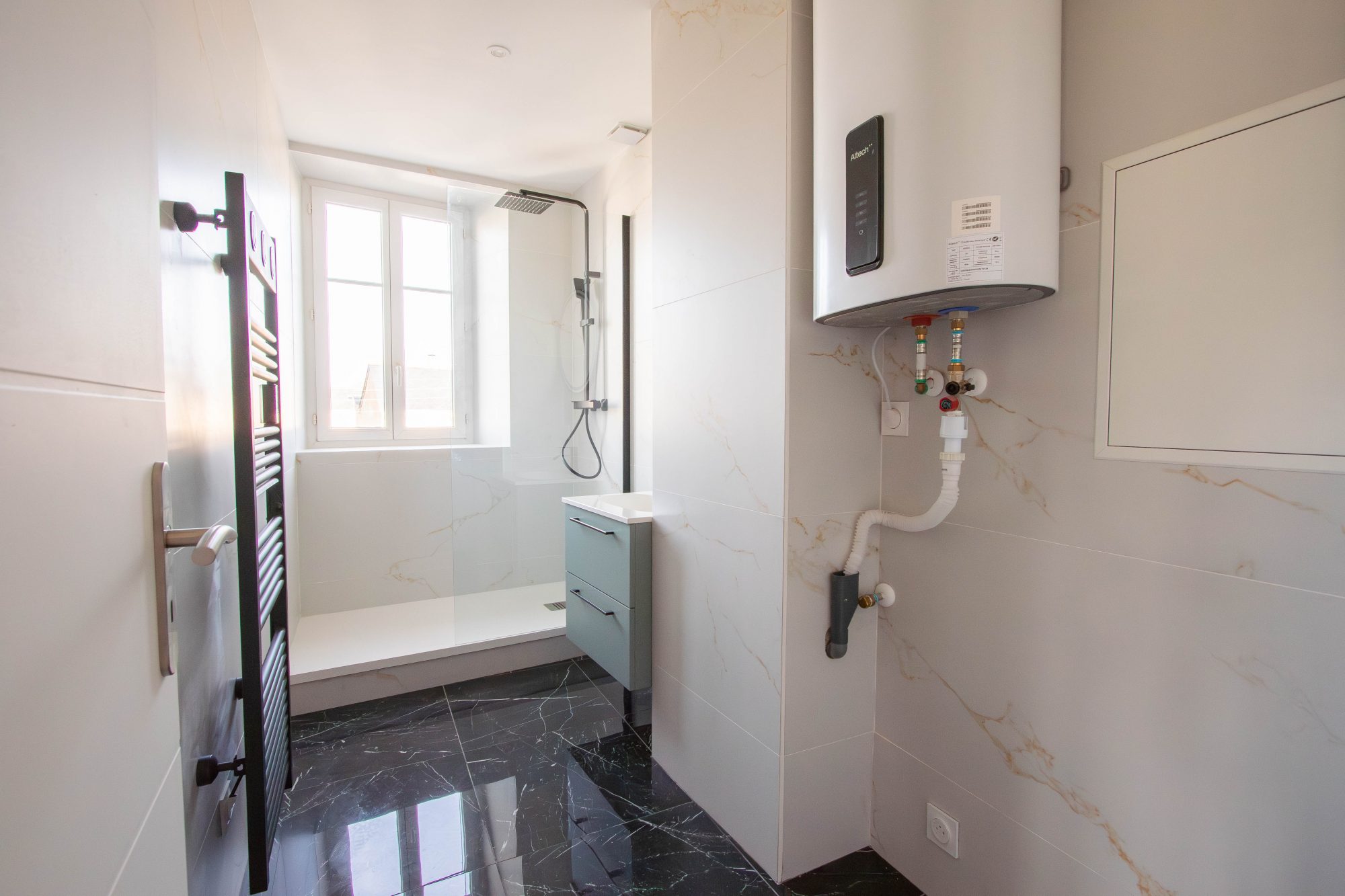 Salle d'eau avec douche, SV, emplacement MAL, sèche serviette, sur carrelage
