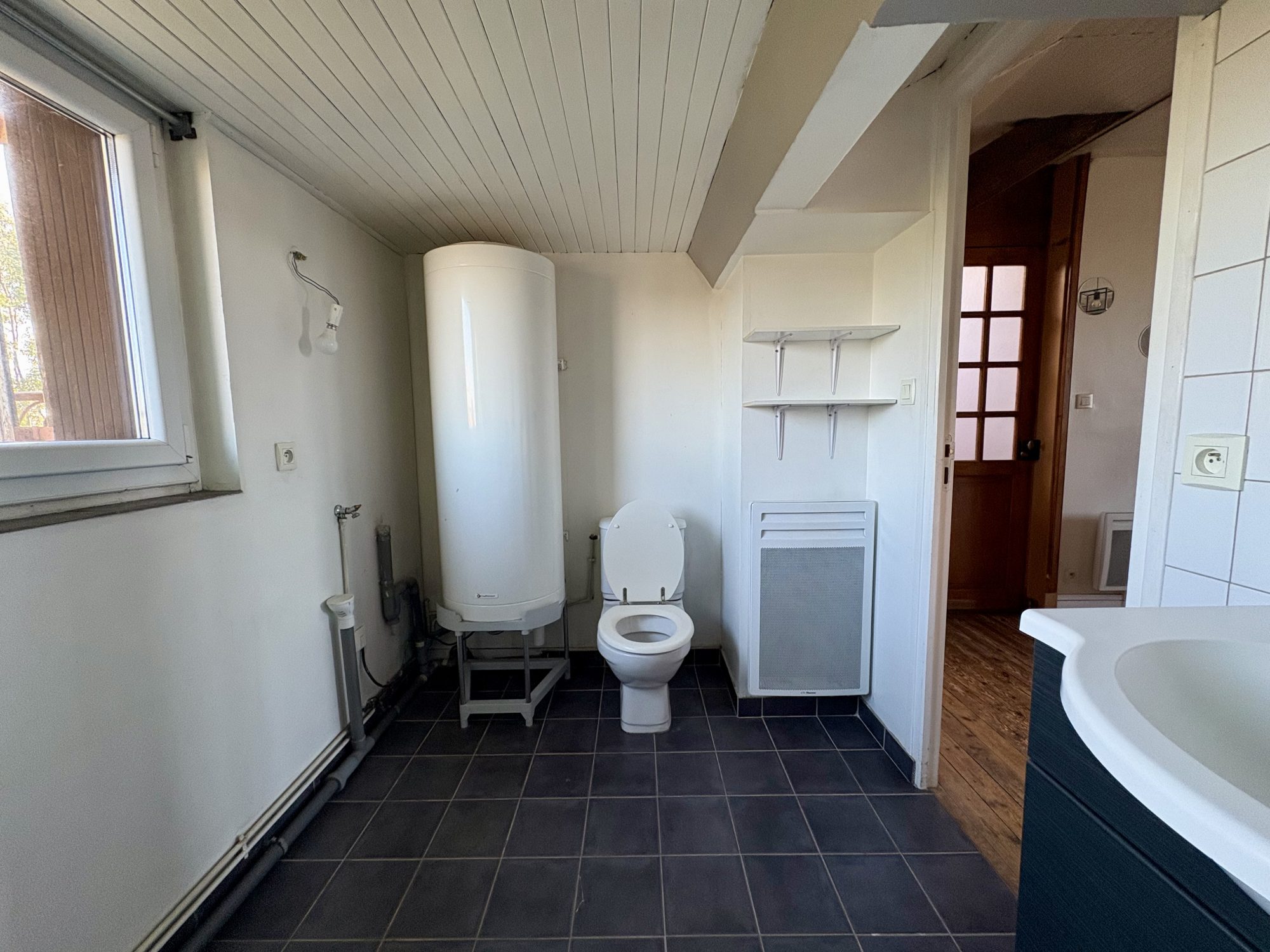 Salle de bains avec WC, simple vasque et baignoire, ballon eau chaude, sur carrelage