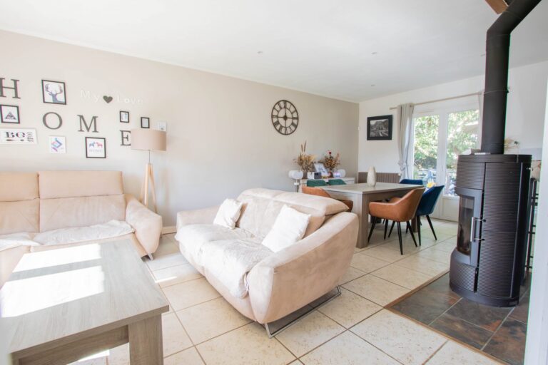Séjour salon sur carrelage avec poêle à bois et accès terrasse