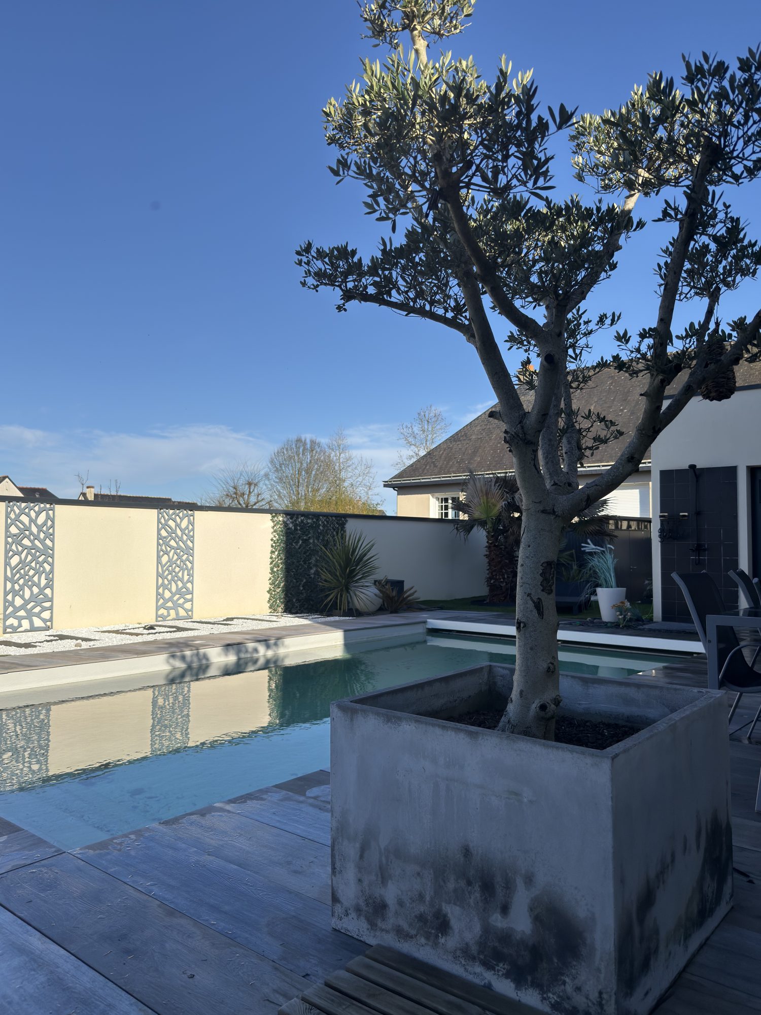 À l’extérieur, le cadre devient exceptionnel. Le jardin paysagé équipé d’un puit d’arrosage automatique prolonge naturellement les espaces intérieurs. Deux terrasses totalisant 80 m² permettent de profiter des différentes expositions. La piscine s’intègre parfaitement à l’ensemble et devient le point central des beaux jours, créant une atmosphère intime et chaleureuse.