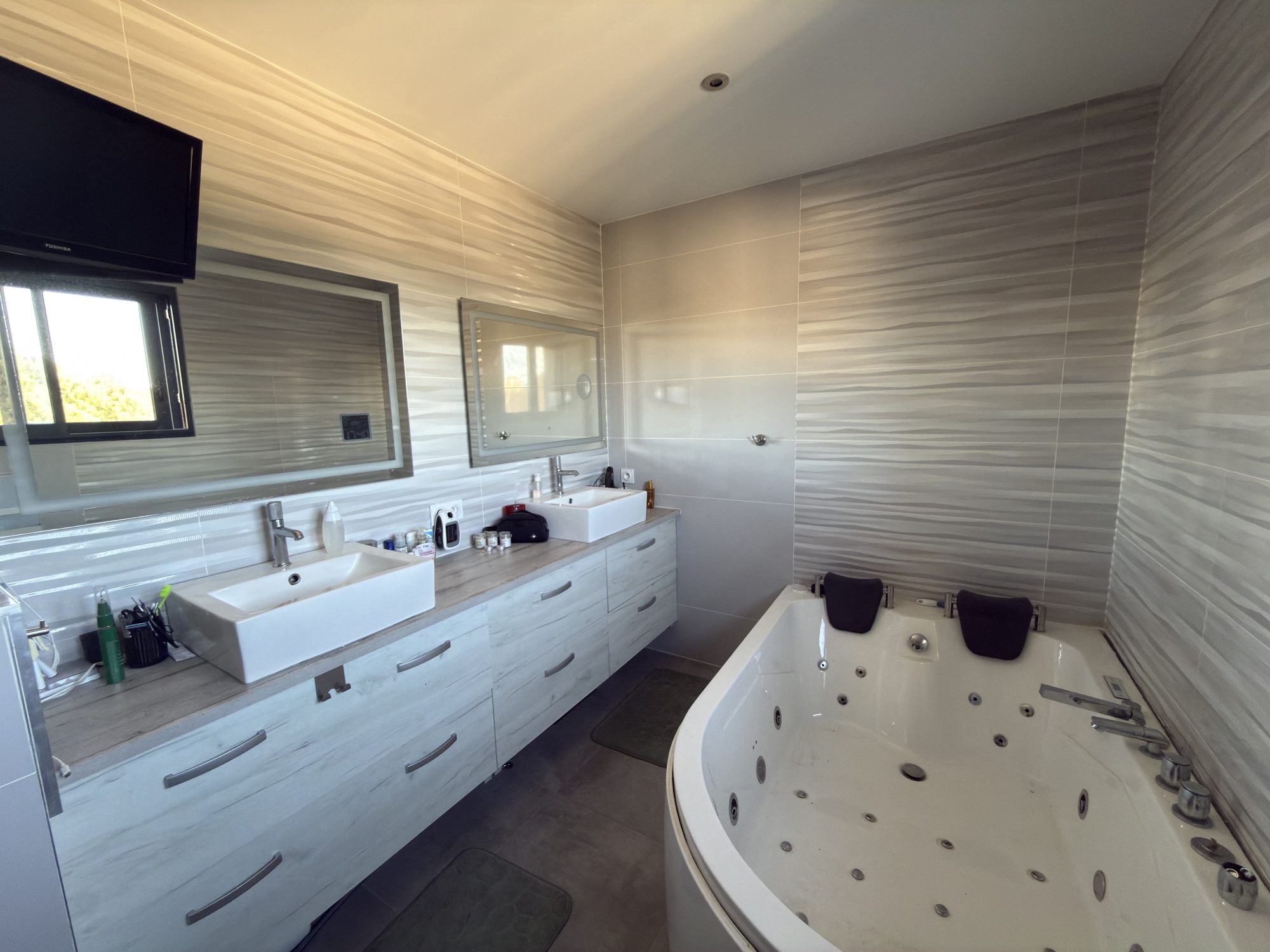Salle de bain et salle d’eau avec meuble double vasque et WC suspendu, sur carrelage