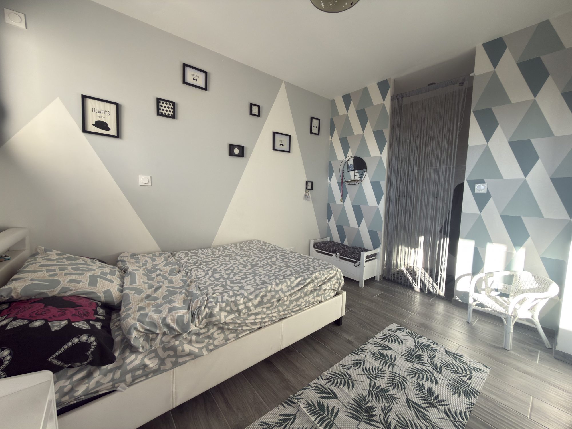 Chambre 2 sur carrelage avec placard de rangement, salle d’eau et meuble simple vasque