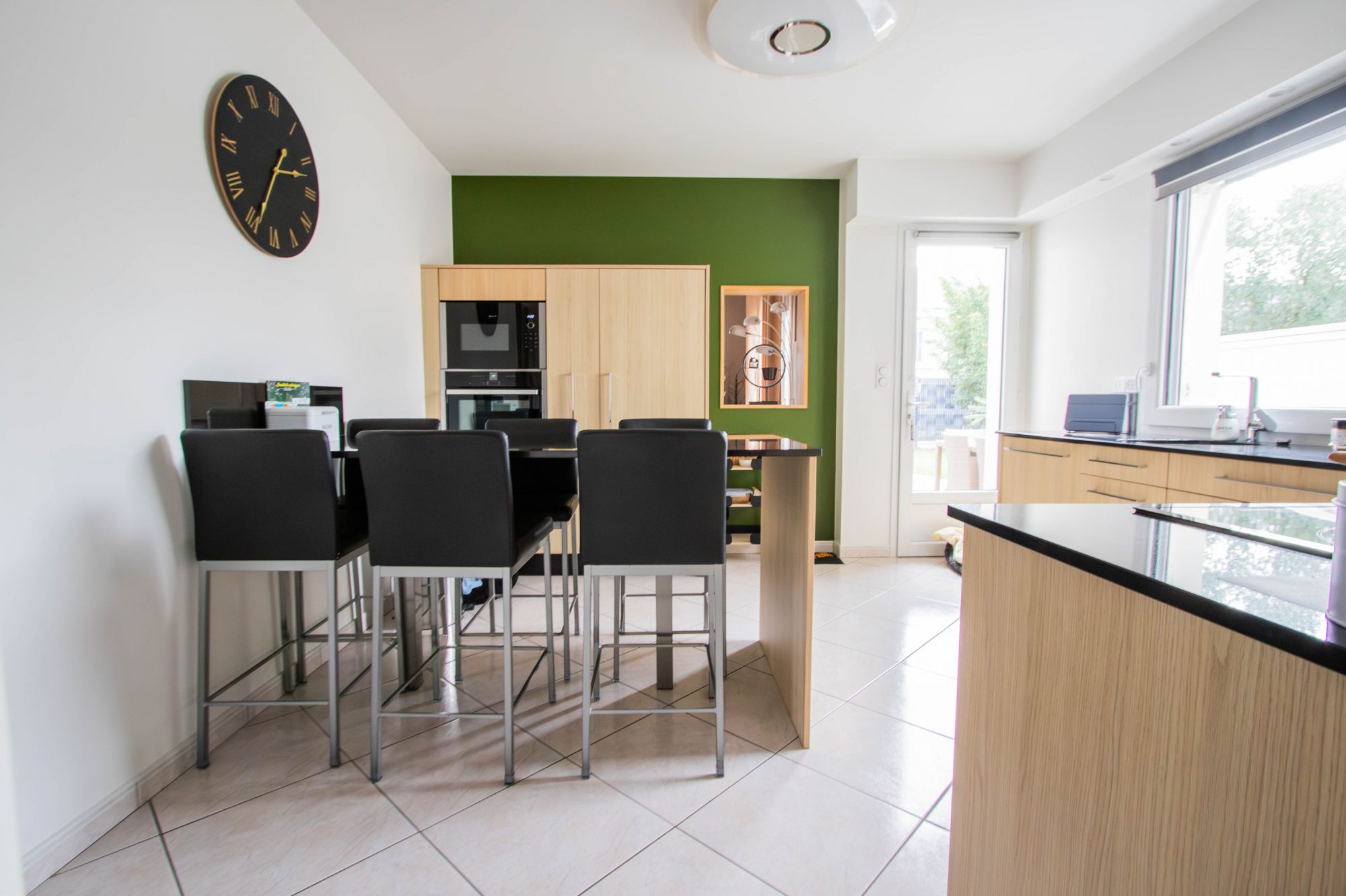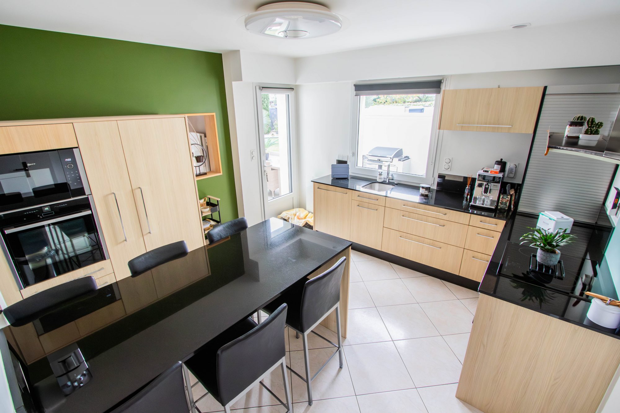 Cuisine A/E (réfrigérateur, four, micro-ondes, plaques vitro, hotte, lave-vaisselle), accès terrasse et garage, sur carrelage