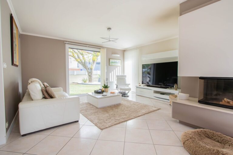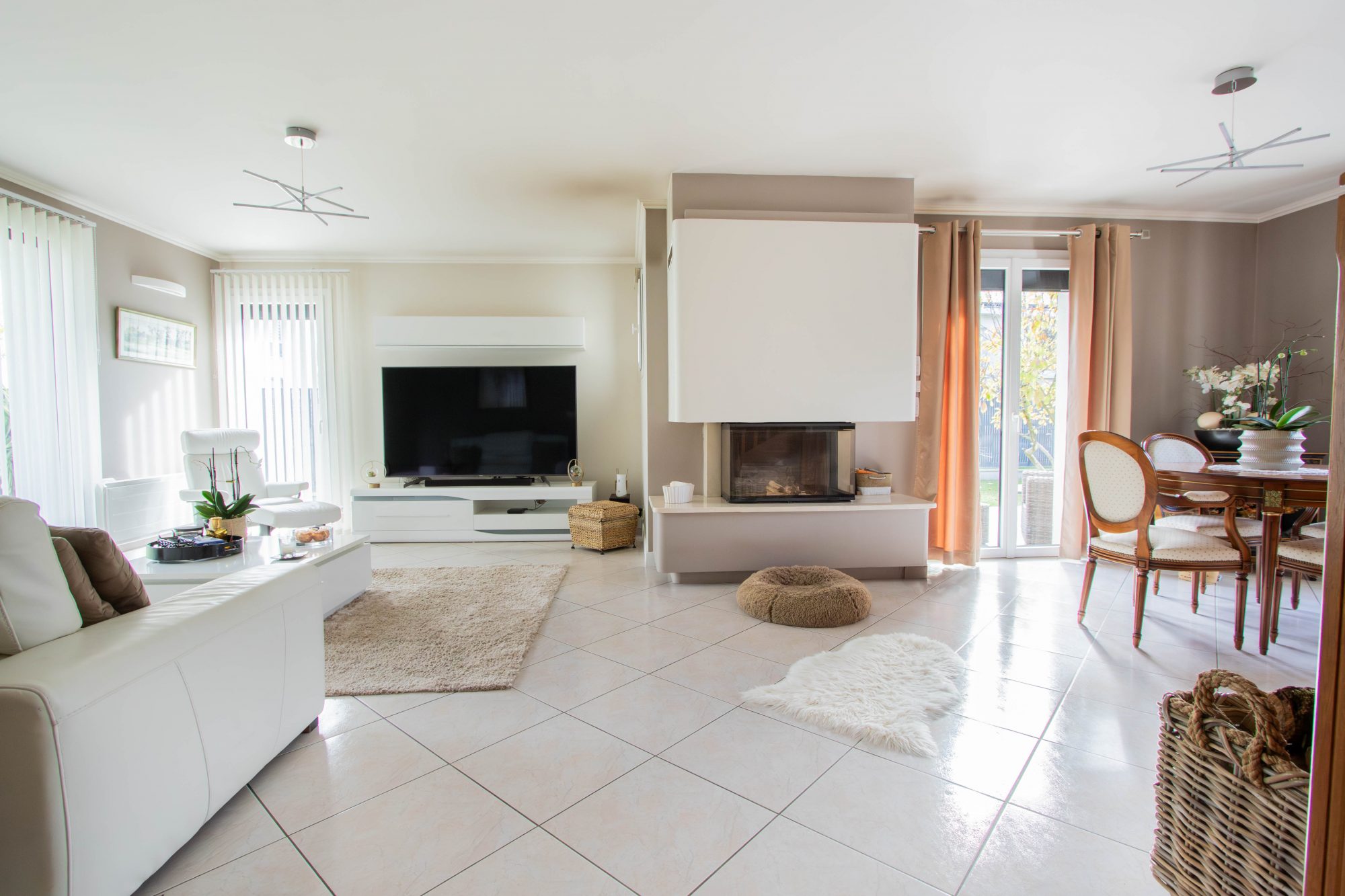 Salon séjour avec cheminée, accès terrasse, sur carrelage