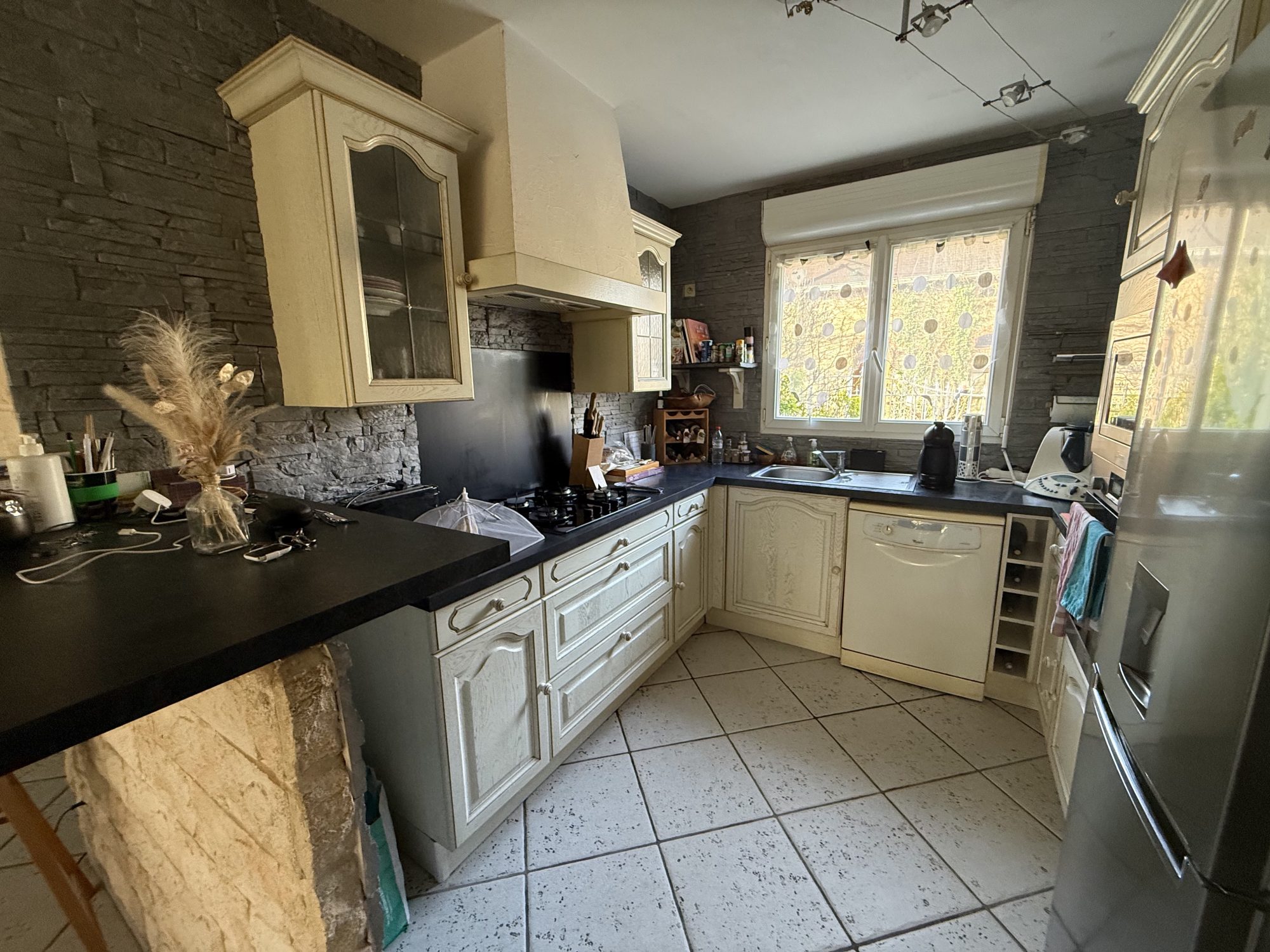 Cuisine, carrelage, four, plaques au gaz, micro-onde, lave-vaisselle, hotte