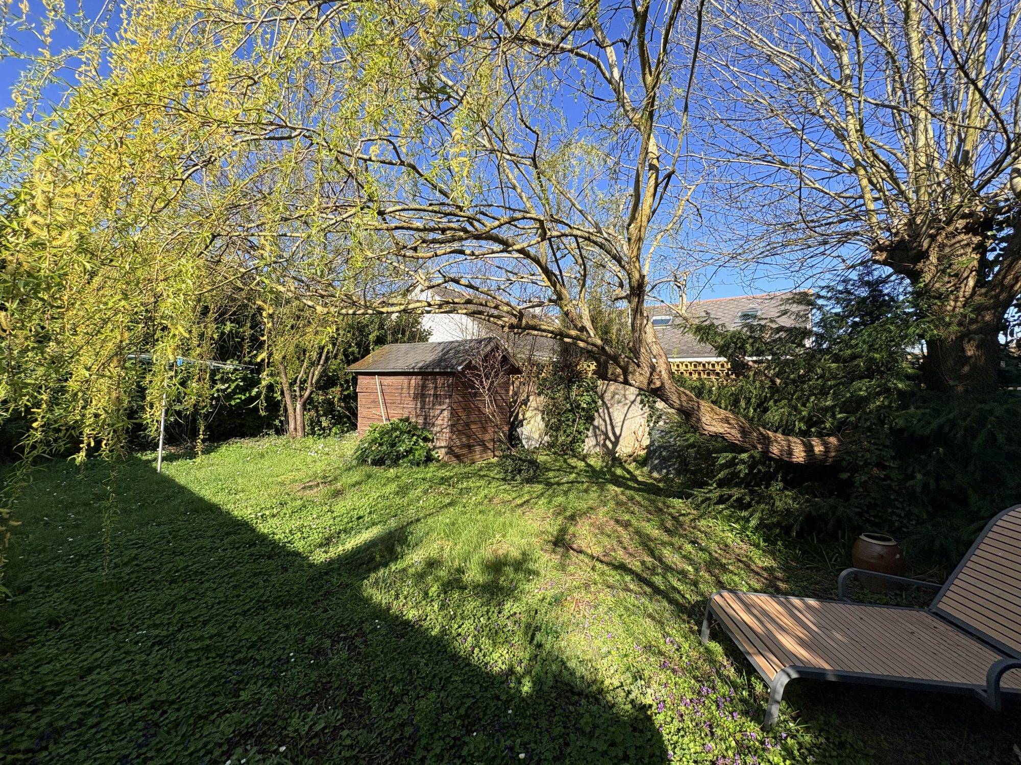 La cuisine ouverte s’ouvre sur un lumineux salon/séjour, avec un accès direct vers un jardin arboré agrémenté d’une belle terrasse en bois, parfaite pour vos moments de détente.